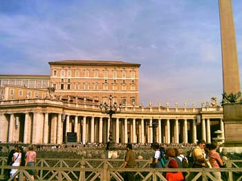 Der Segen war nicht so toll da der Papst selbst nicht da war. Trotzdem war der Platz voll. Die Leinwände auf denen der Segen übertragen wurde waren von unserem Platz aus gut zu sehen da wir auf einem Brunnenrand saßen. Von dort aus konnten wir auch die anderen entdecken die wir sonst wohl nie gesehen hätten.