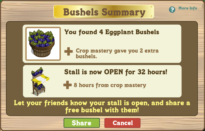 Haben wir genügend Bündel (bushels) erreicht um den Markt zu öffnen erscheint ein großes Fenster. Es zeigt uns an wie viele Bündel wir in unserem Market Stall haben, das dieser nun für eine bestimmte Anzahl von Stunden geöffnet ist. Das durch das ernten die Bündel mehr geworden sind. Und das wir unsere Nachbarn nun darüber informieren können, das unser Market Stall geöffnet ist. Wir klicken mit der linken Maustaste auf „share“.