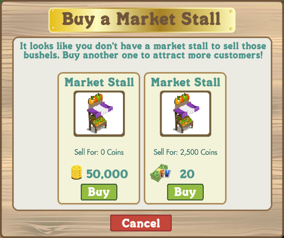 Bevor wir die Bündel (bushels) das erste mal sammeln können erhalten wir die Meldung das wir einen Market Stall benötigen und bekommen diesen gleich gratis geschenkt. Wir müssen ihn nur auf unserer Farm platzieren.