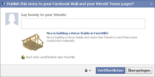 Wenn wir ihn platziert haben, erscheint eine Meldung die wir an unsere Startseite senden können. Eine Nachricht für unsere FarmVille Nachbarn das sie uns Baumaterial senden können.