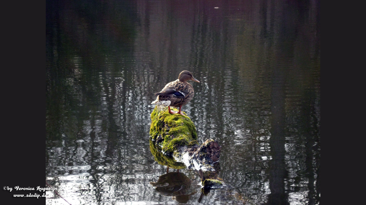 Beim Wasserschloss Wittringen schwimmen sehr viele Enten auf dem Wasser. Eine davon hat es sich aus dem Wasser herausragenden Baumstumpf bequem gemacht.